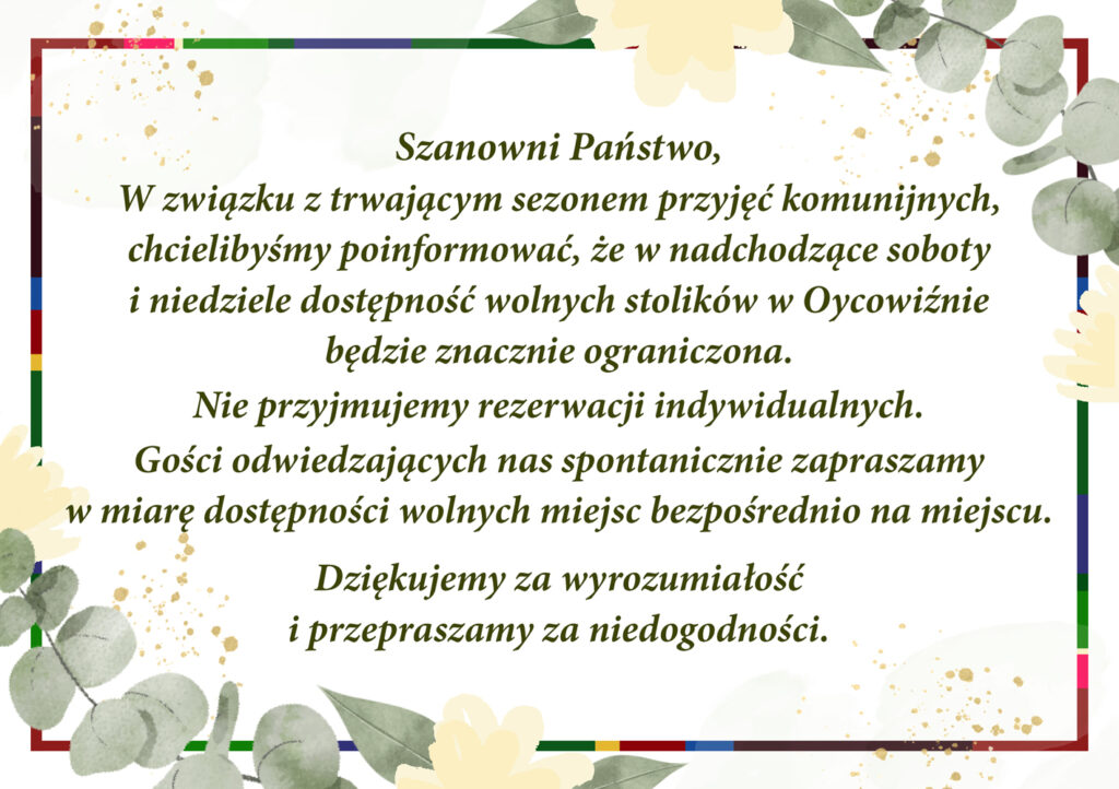 Kryty strzechą, stylowo i klimatycznie urządzony Gościniec Oycowizna to restauracja pod Warszawą z tradycyjną kuchnią polską oraz noclegi w komfortowych pokojach hotelowych o wysokim standardzie. Oycowizna to także imprezy okolicznościowe: wesela, komunie, chrzciny, urodziny, spotkania firmowe i biznesowe oraz catering na imprezy. Noclegi blisko Warszawy – sala weselna Warszawa i okolice.