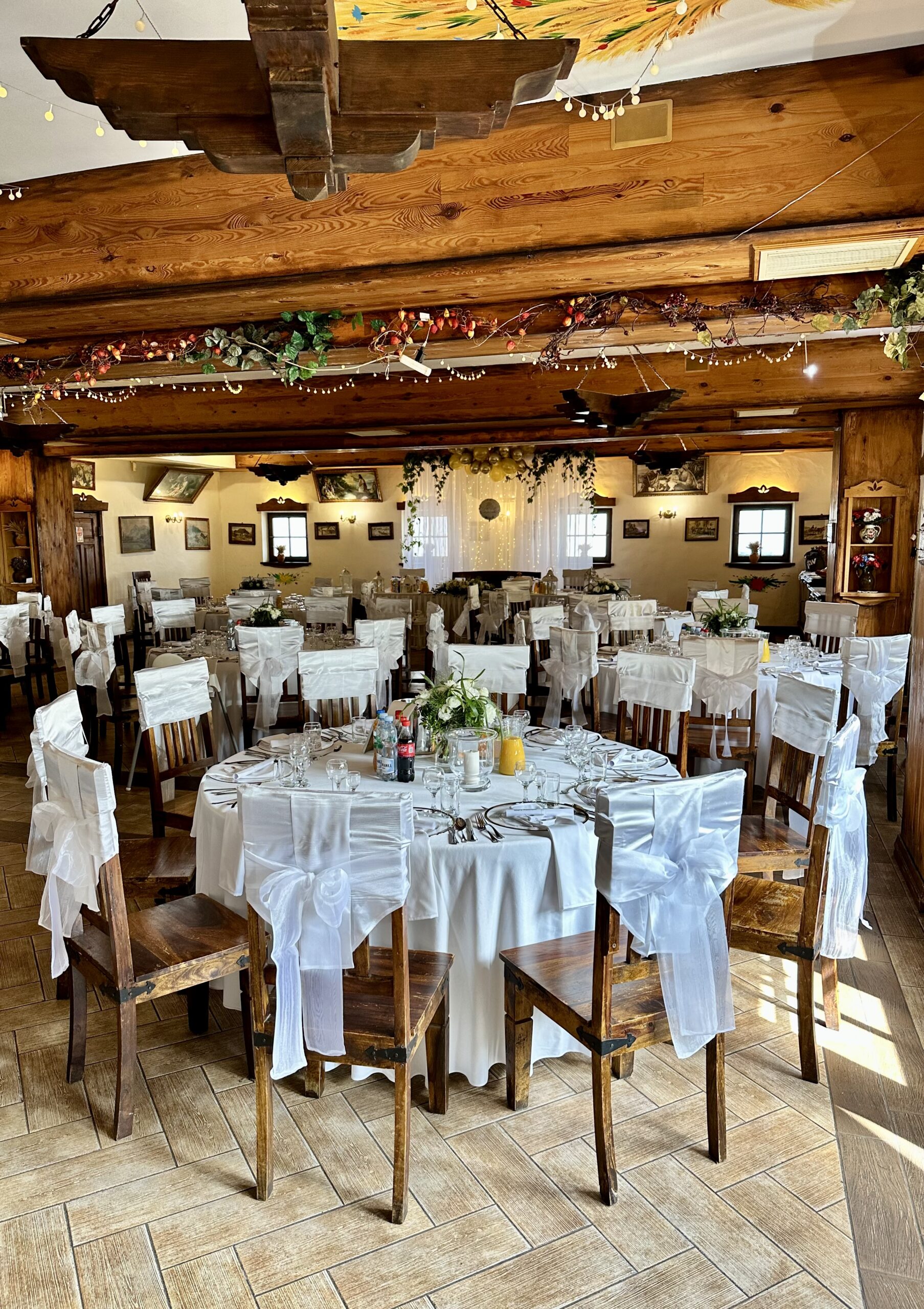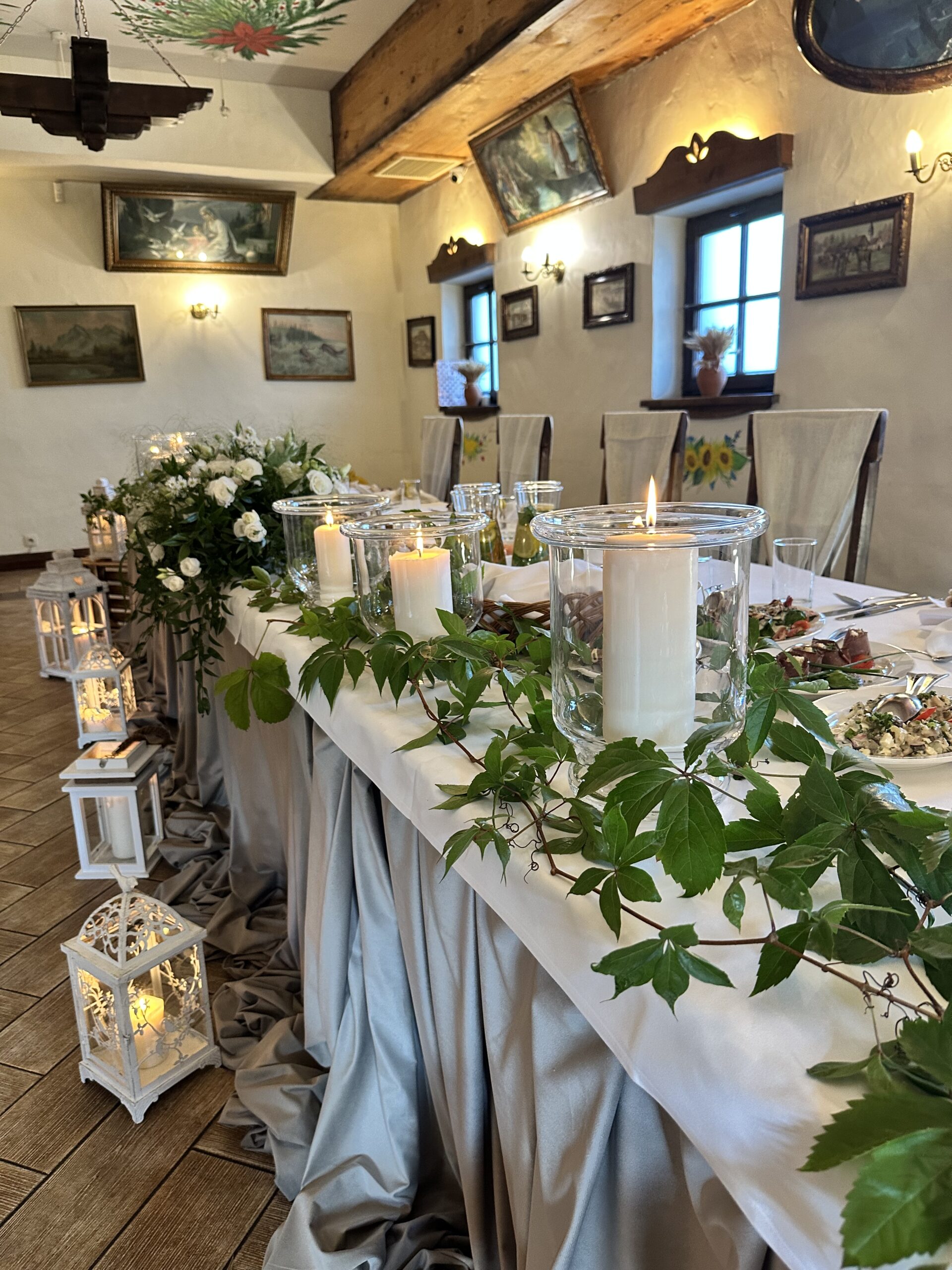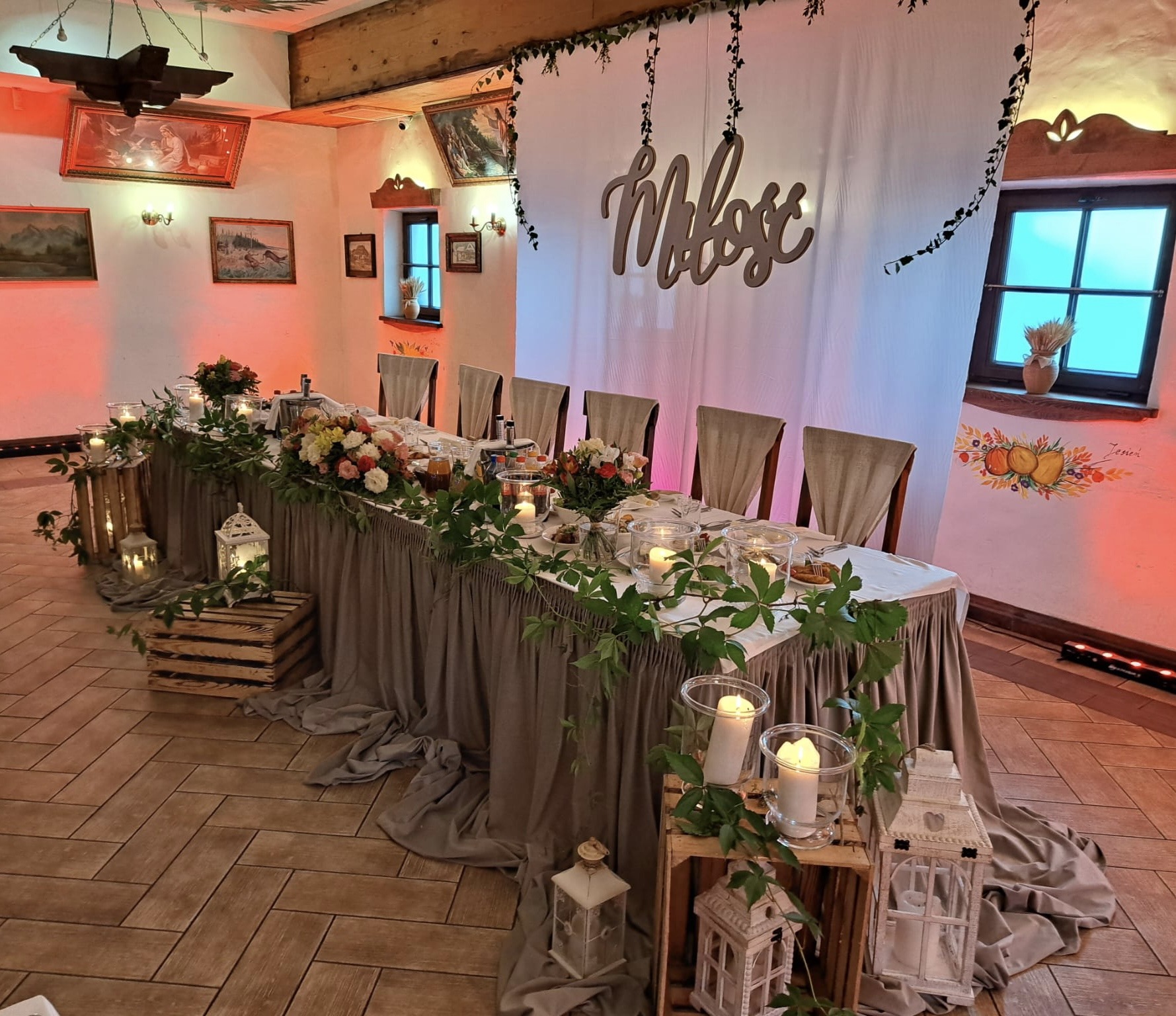 Oycowizna Guesthouse is the perfect place for a wonderful wedding reception. The original and atmospherically decorated 282㎡ room has a separate entrance and is equipped with a sound system and air conditioning. It will provide a unique wedding atmosphere in boho or glamour style. The bride and groom are provided with an overnight stay in the honeymoon suite, equipped with a heart-shaped bathtub and Jacuzzi.